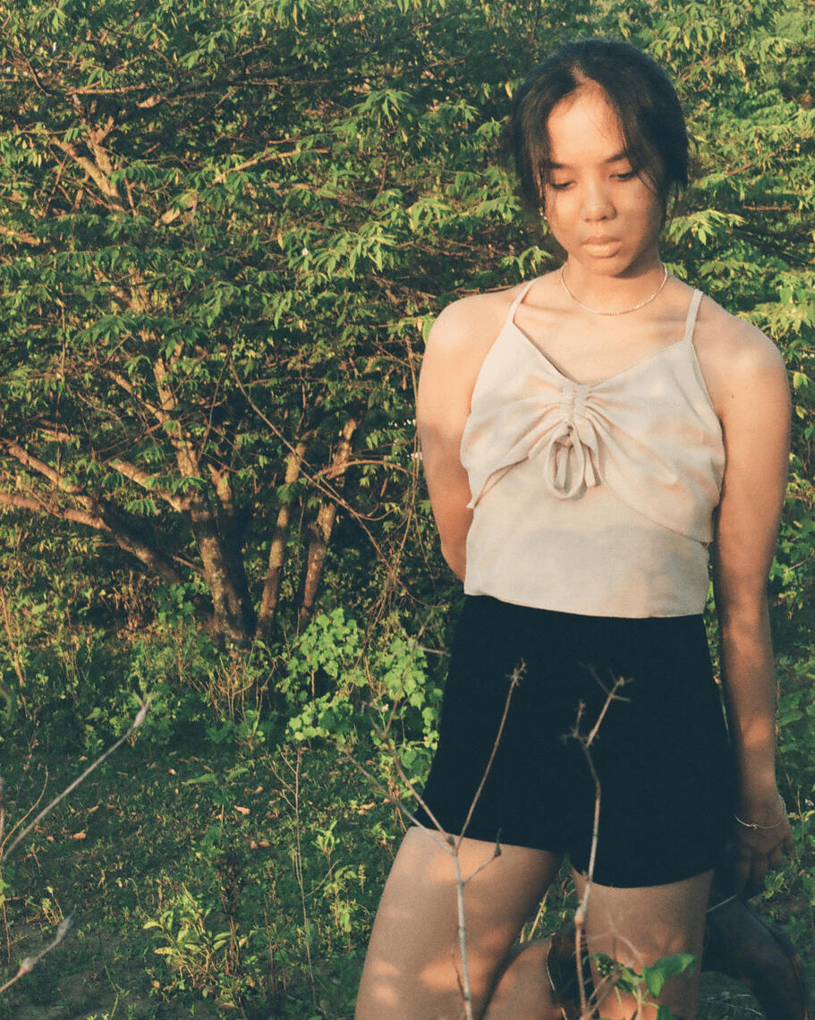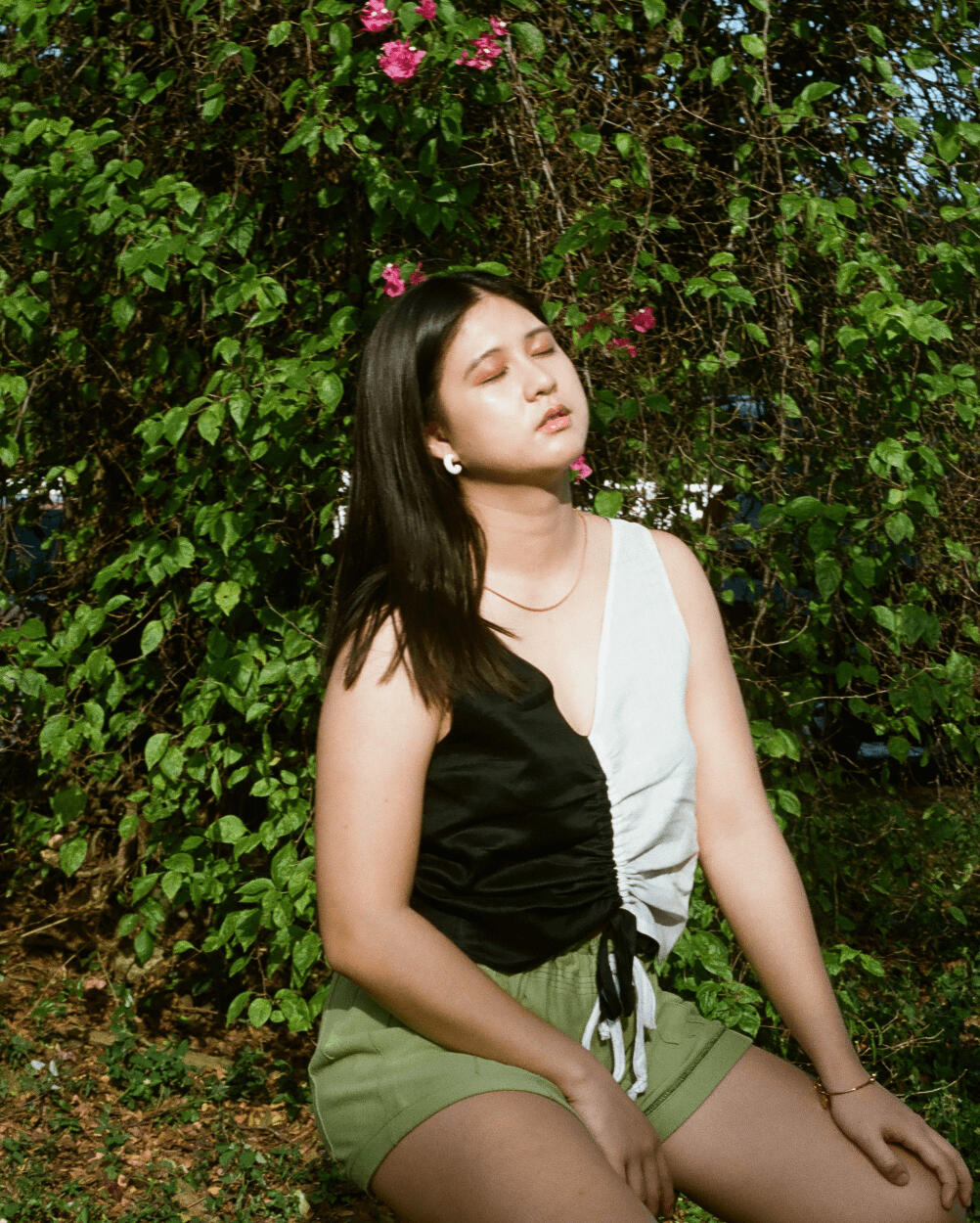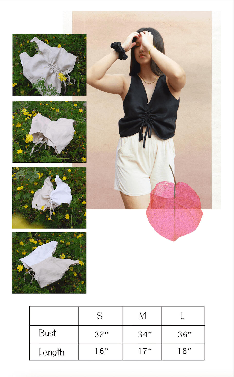 4-way reversible v-neck crop top that can be worn with drawstring features or shell buttons at the front or back. Gusot-Mayaman