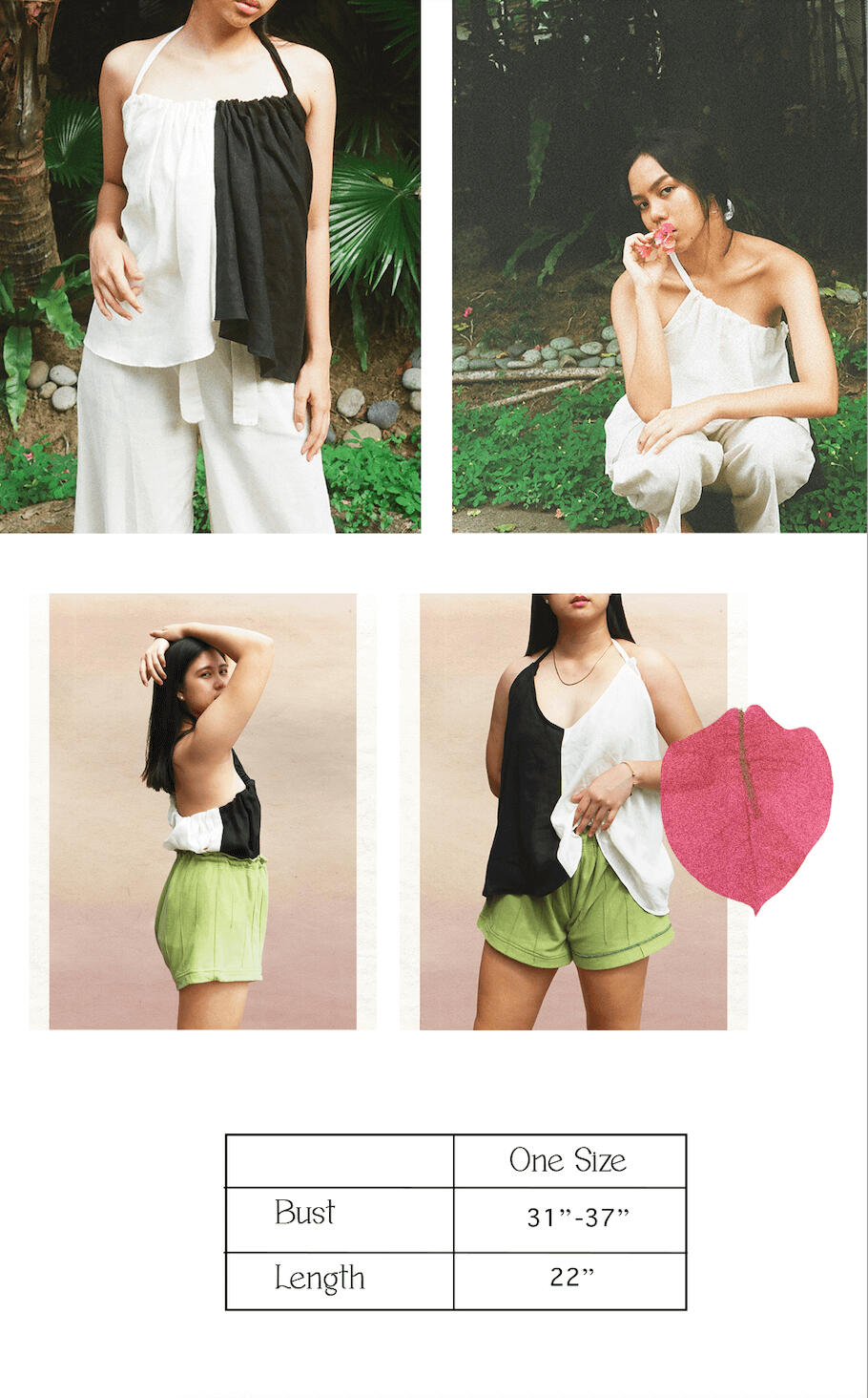 Hanging asymmetrical linen top with reversible black and white features. Adjusts well via contrast ribbon. Fits well on Bust 31" to 36". Can be worn in multiple ways.