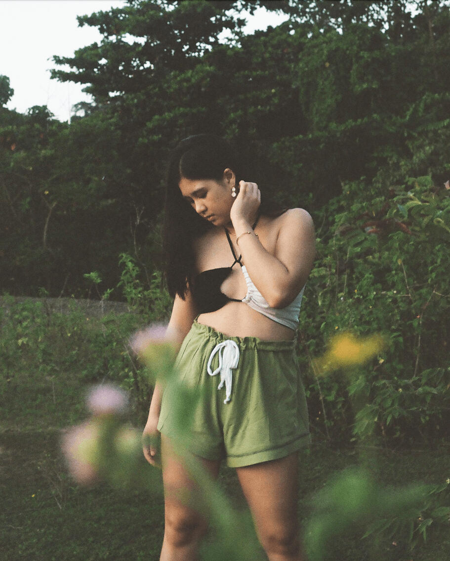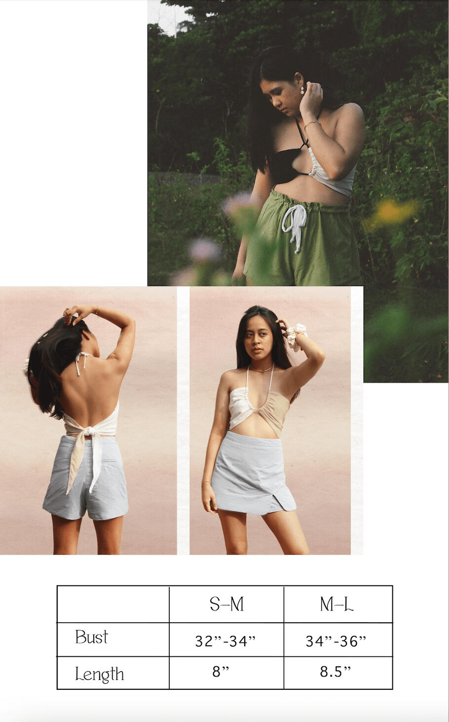 4-way reversible v-neck crop top that can be worn with drawstring features or shell buttons at the front or back. Gusot-Mayaman
