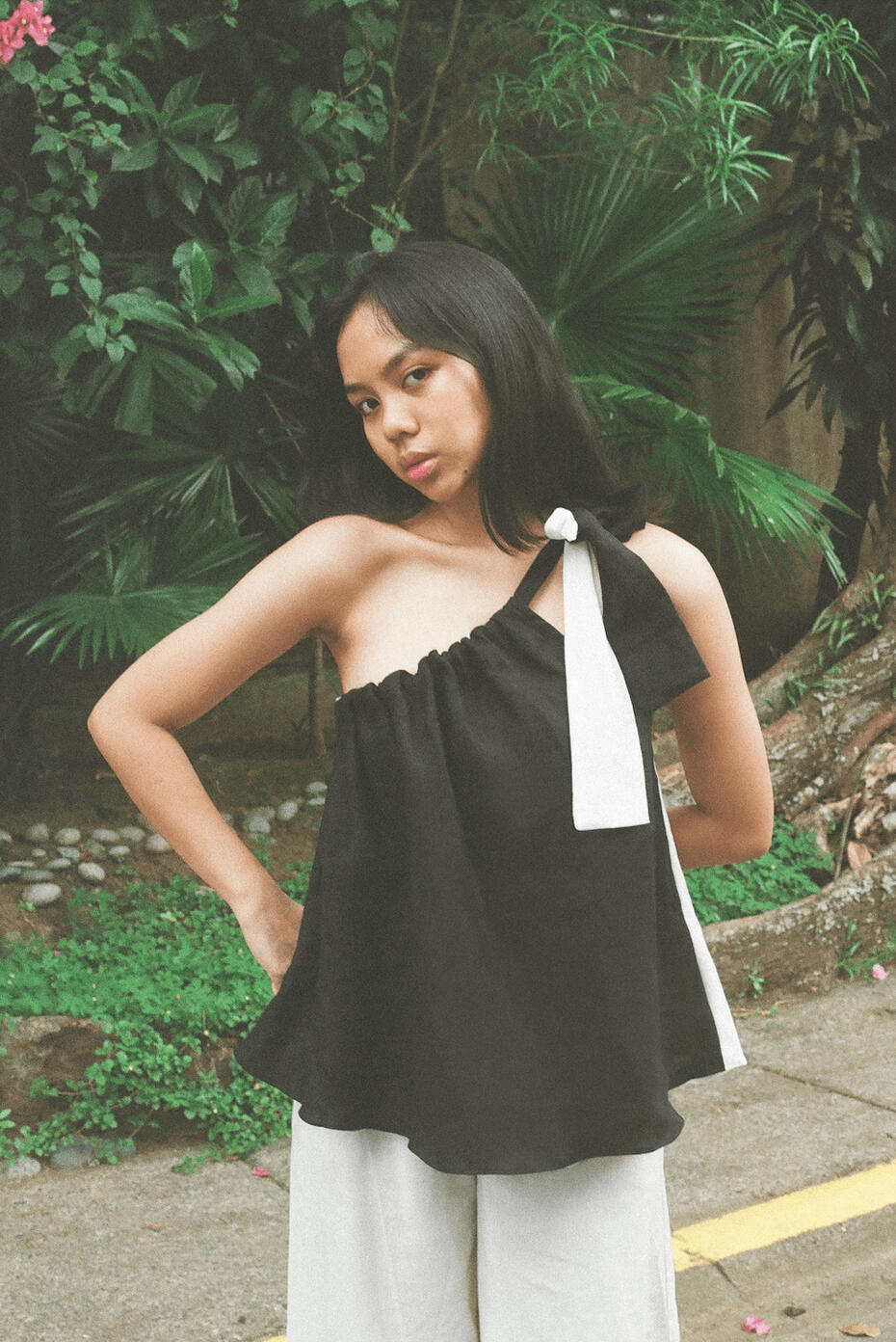 Hanging asymmetrical linen top with reversible black and white features. Adjusts well via contrast ribbon. Fits well on Bust 31" to 36". Can be worn in multiple ways.